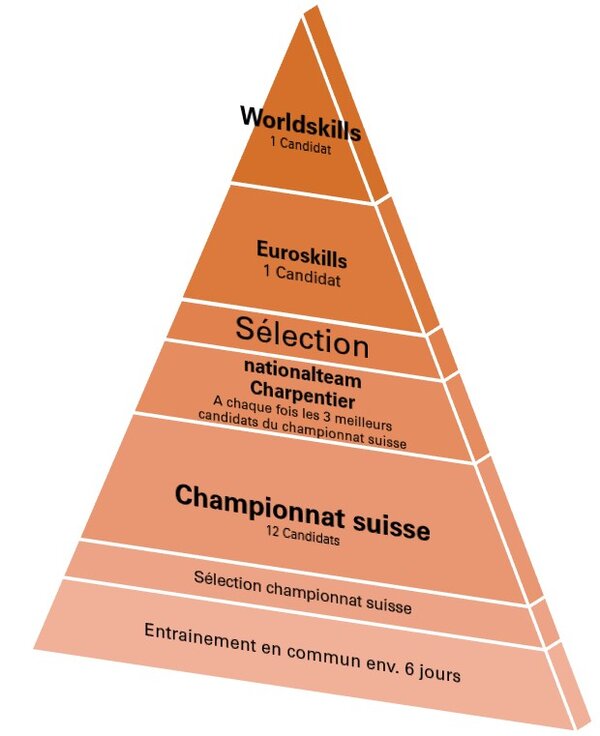 Les championnats de charpenterie ont une organisation différente de ceux de menuiserie-ébénisterie, bien que quelques étapes se déroulent en même temps. Il y a deux cursus différents. Un cursus uniquement romand mène au championnat romand et l’autre jusqu’aux championnats EuroSkills et WordSkills. Ces deux se déroulent en parallèle et n’ont pas d’influences sur l’autre.