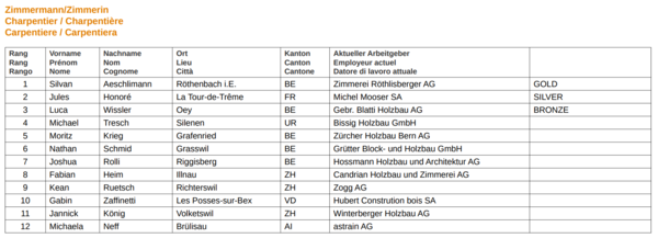 Les deux romands se sont respectivement classés à la 5ème place pour Joseph Laurençon de Vérossaz (VS) en formation chez Christian Voeffreay Charpente SA à Vérossaz (VS) et 9ème place pour Wim Flückiger de la Tour de Peilz (VD) en formation chez Atelier Volet SA à St-Légier (VD) .